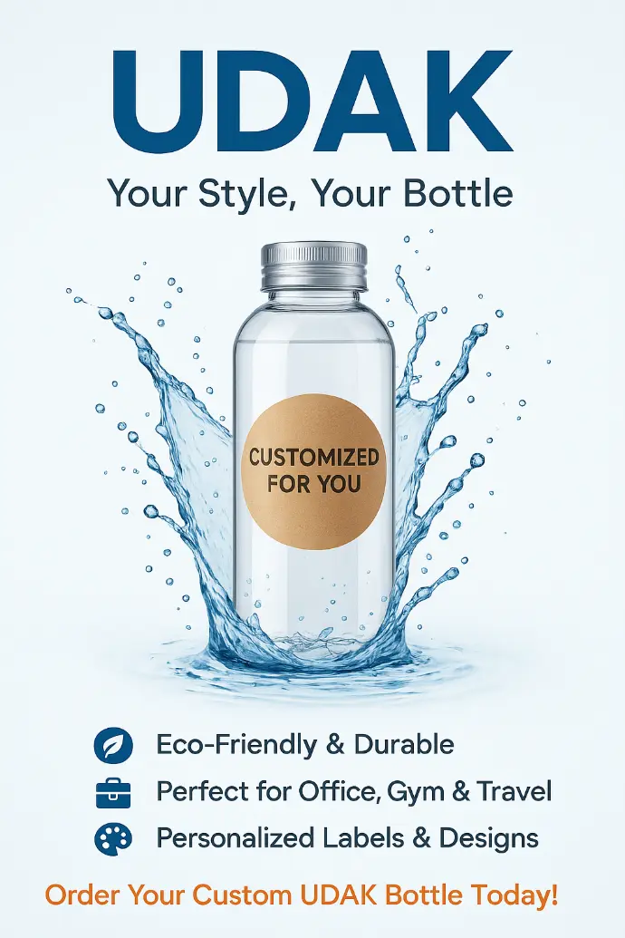 Stay refreshed with the UDAK customized water bottle – designed with premium, eco-friendly materials, durable finish, and a sleek design. Perfect for daily hydration, travel, office, or gifting, this bottle can be tailored with your brand logo, name, or special design to make it truly unique.”